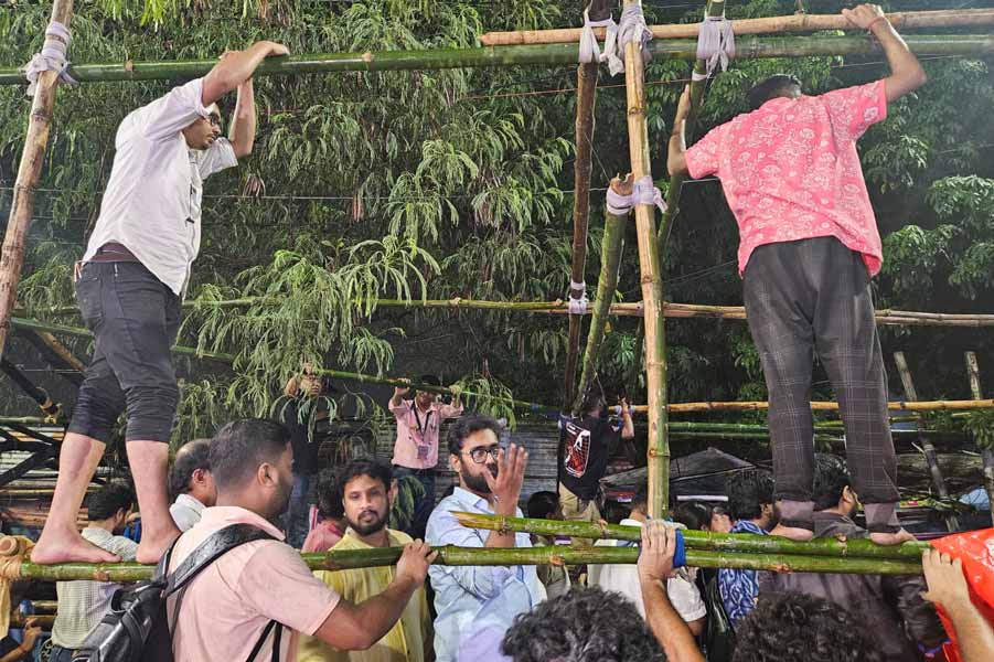 মঞ্চ বাঁধছেন জুনিয়র ডাক্তারেরা। —নিজস্ব চিত্র।