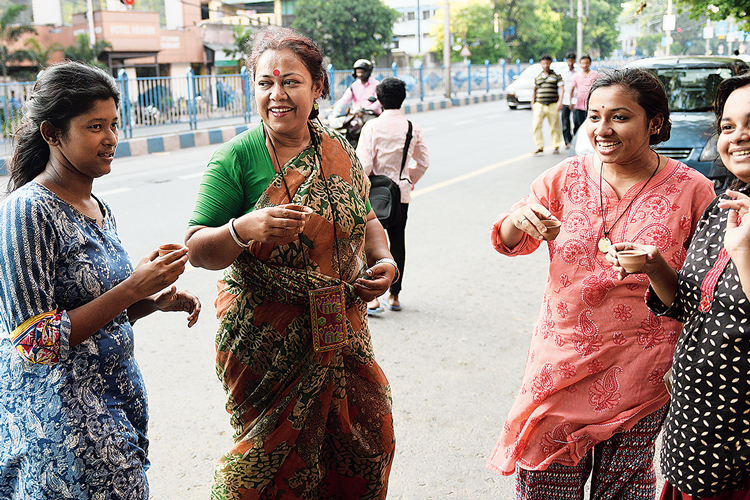 পারিবারিক: এ জে সি বসু রোডে মেয়ে সম্পৃক্তার সঙ্গে আড্ডায় উত্তর কলকাতার বাম প্রার্থী কনীনিকা বসু ঘোষ। শুক্রবার। ছবি: সুমন বল্লভ