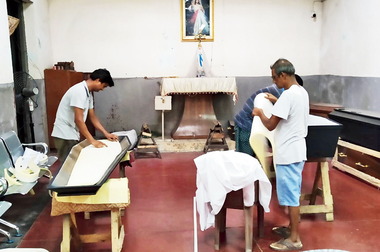 যে নিয়ম মেনে ভোটেও সারা দিন খোলা থাকবে পিস হেভন। ‘‘মৃত্যু তো দিনক্ষণ দেখে আসে না। তাই পিস হেভন খোলাই থাকবে।’’ কথাগুলো বলছিলেন জাস্টিন নাগেল, পিস হেভনের অন্যতম মুখপাত্র। সংশ্লিষ্ট সম্পত্তি নিয়ে বিবাদ চলছে। একশো বছরের পুরনো বিল্ডিংয়ের মতোই সে আইনি বিবাদও পুরনো। এমনিতে পিস হেভনের সঙ্গে অগুনতি ভিআইপি-র নাম জড়িয়ে রয়েছে! ‘‘এটাই আমাদের প্রধান সমস্যা জানেন তো! সকলে ভাবেন যে পিস হেভন শুধুমাত্র ভিআইপি-দের জন্য। এটা সাধারণ মানুষের জন্যও।’’ আক্ষেপ নাগেলের। এই মুহূর্তে কফিন তৈরির ব্যস্ততা চলছে। নাগেল জানালেন, শুধু তো দেশেই নয়, কোনও বিদেশি যদি এখানে কাজে বা ঘুরতে এসে মারা যান, তা হলে সংশ্লিষ্ট দেশের দূতাবাস তাঁদের সঙ্গেই যোগাযোগ করে। তখন কফিনবন্দি করে তাঁরাই সেই মৃতদেহ সে দেশে পাঠানোর ব্যবস্থা করেন। নাগেল বলছিলেন, ‘‘বর্তমানে ১১টি চেম্বার রয়েছে। অনেক সময়ে সেগুলো পুরো ভর্তি হয়ে যায়, অনেক সময়ে ফাঁকা থাকে।’’