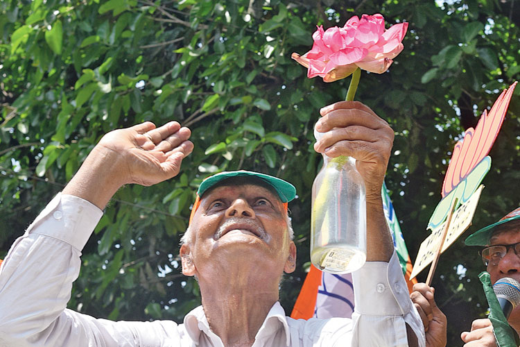 উত্তর কলকাতা লোকসভা কেন্দ্রের বিজেপি প্রার্থী রাহুল সিংহের প্রচারের সময়ে পদ্ম হাতে এক সমর্থক। খন্না এলাকায়।