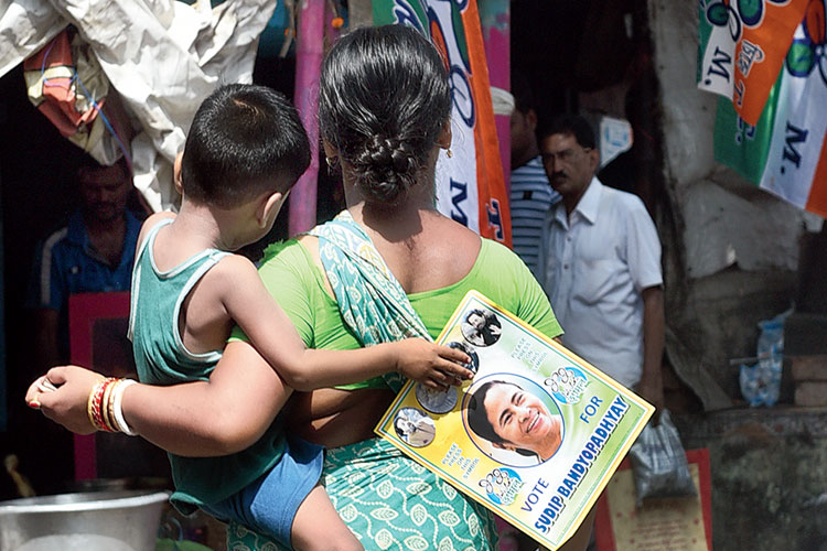উত্তর কলকাতা কেন্দ্রের তৃণমূল প্রার্থী সুদীপ বন্দ্যোপাধ্যায়ের প্রচারে মায়ের কোলে পোস্টার হাতে খুদে। রবিবার, বাগমারি এলাকায়।