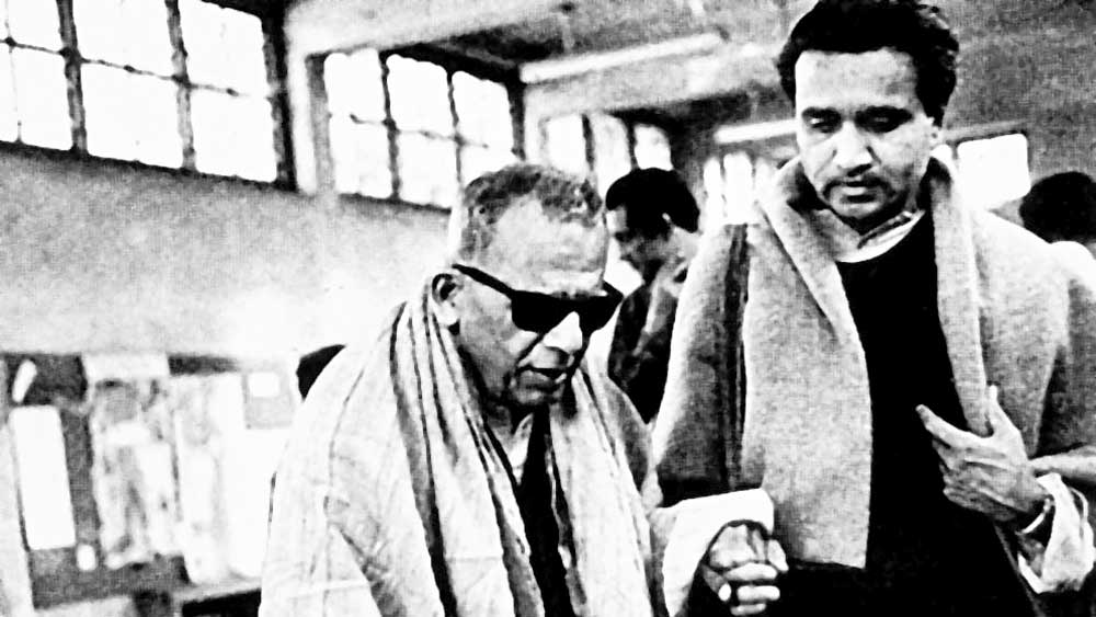 ‘সংযোগের অভিপ্রায়ে তৈরি করে তোলা আমাদের সমস্ত ভাষারই মধ্যে আমরা... ছড়িয়ে রাখতে চাই নীরবতার পরিসর,’ বলেছিলেন শঙ্খ ঘোষ (অন্ধের স্পর্শের মতো/ প্রণবেশ সেন স্মারক বক্তৃতা)। একই সংযোগসূত্রের কথা বলেছিলেন বিনোদবিহারী মুখোপাধ্যায়ও, ছাত্র সত্যজিৎ রায়কে: ‘যে জিনিসটা স্পর্শ করছি সেটা ছাড়া আর কোন কিছুরই অস্তিত্ব থাকে না। তোমরা চেয়ার দেখলেই বুঝতে পারছো সেটা আছে, আমি চেয়ারে বসলে পরে তবে বুঝেছি সেটা আছে... ’ স্পর্শগুণের মাহাত্ম্যই স্মরণীয় করে রেখেছে বিনোদবিহারী মুখোপাধ্যায়কে (১৯০৪-১৯৮০)। শান্তিদেব ঘোষের বাবা কালীমোহন ঘোষের প্রেরণায় শান্তিনিকেতনে আসা। তত দিনে তাঁর স্থায়ী ক্ষীণদৃষ্টির ব্যাপারে নিশ্চিত ডাক্তার। রবীন্দ্রনাথের নির্দেশে নন্দলাল বসুর কাছে শুরু শিল্পপাঠ, ১৯২৫-এ কলাভবনের শিক্ষক। তাঁর বহু ছাত্র ভারতশিল্পকে সমৃদ্ধ করেছেন— কে জি সুব্রহ্মণ্যম, রীতেন মজুমদার, সত্যজিৎ রায়, দিনকর কৌশিক। পরবর্তী কালে দিনকর কৌশিকের চেষ্টাতেই বিনোদবিহারী (বাঁ দিকের ছবিতে তাঁরা দু’জন) অধ্যাপক পদে উন্নীত হন। মুসৌরিতে থাকাকালীন বেশ কিছু ব্লক ডিজ়াইন, ছোট ছোট মূর্তি করেছিলেন (ডান দিকের ছবিতে কুকুরের মূর্তিটি এই সময়েরই সৃষ্টি)। ১৯৫৮-তে ফের কলাভবনে। তত দিনে দৃষ্টিশক্তি প্রায় লুপ্ত। শুরু হল স্পর্শযাপন, নরম মোমের তালে বিশ্বপ্রকৃতির প্রতিবিম্ব গঠন। কাগজ, ক্যানভাস, মাটি, মোম, সেরামিক টালি— সবই হয়ে ওঠে তাঁর রূপভাষা প্রকাশের মাধ্যম। গতকাল ছিল ‘মাস্টারমশাই’-এর জন্মদিন।