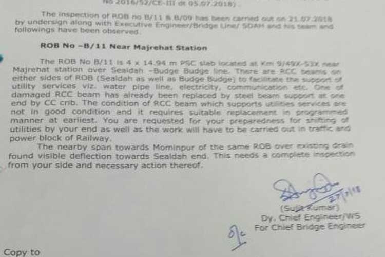 ২৭ জুলাই ওই চিঠি লিখেছেন পূর্ব রেলের মুখ্য ব্রিজ ইঞ্জিনিয়ারের পক্ষ থেকে চিঠি লিখেছেন ডেপুটি চিফ ইঞ্জিনিয়ার সুজিত কুমার। নগরোন্নয়ন দফতরের সুপারিন্টেডেন্ট ইঞ্জিনিয়ারকে লেখা চিঠিতে বলা হয়েছে, আরওবি বি-১১ (মাঝেরহাট ব্রিজের রেলের সাঙ্কেতিক পরিচয়) এর কংক্রিট কাঠামোর একাধিক জায়গায় অবস্থা বেশ খারাপ। ট্রেন লাইন সংলগ্ন একটি অংশে ইস্পাতের বিম দিয়ে ঠেকাও দেওয়া হয়েছে রেলের তরফে।