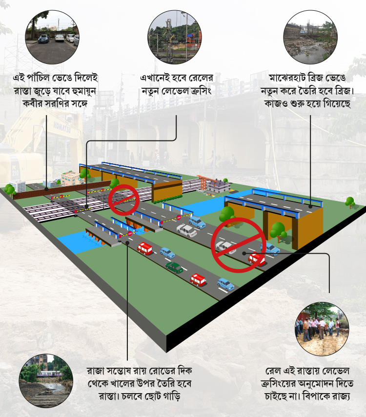 রেলের তরফে একটি মাত্র লেভেল ক্রসিংয়ের ছাড়পত্র দেওয়া নিয়ে নতুন করে জটিলতাও তৈরি হয়েছে। রাজ্য প্রথমে মাঝেরহাট ব্রিজের পাশ দিয়ে ৮ মিটার চওড়া একটি রাস্তা তৈরি করতে চেয়েছিল। সেই রাস্তা তৈরির কাজ ইতিমধ্যেই শুরু হয়ে গিয়েছে। ওই এলাকায় খালের গভীরতা কত, ক’টা হিউম পাইপ লাগবে, সেই সব সংক্রান্ত আরও খুঁটিনাটি বিষয়ে পূর্ত দফতর অনেকটাই এগিয়ে গিয়েছে। কিন্তু, রেল জানিয়ে দিয়েছে, ওই রাস্তায় লেভেল ক্রসিং কোনও ভাবেই সম্ভব নয়। অনেক জটিলতা রয়েছে। তার পরিবর্তে দুর্গাপুর ব্রিজের কাছে খালের উপর দিয়ে যে আর একটি বিকল্প রাস্তা (আলিপুরের দিকে রাজা সন্তোষ রায় রোড এবং নিউ আলিপুরের দিকে হুমায়ুন কবীর সরণির সংযোগ হবে) তৈরির পরিকল্পনা রয়েছে, সেখানে লেভেল ক্রসিং সম্ভব। যদিও এই রাস্তা তৈরি করা গেলে, বড় গাড়ি যাতায়াত করতে পারবে না। ছোট গাড়িই চলাচল করবে। রাজ্য সরকারের এক আধিকারিক বলেন, “ওখানে দুই লেনের রাস্তা তৈরি করতেও সমস্যা হবে।’’যদিও দু’টি রাস্তা তৈরির বিষয়ে এখনও আশাবাদীরাজ্য। কিন্তু, রেল তাদের সিদ্ধান্তেই অনড় বলে জানা গিয়েছে।