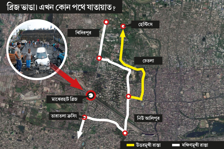 কলকাতা পুলিশ জানিয়েছে, মাঝেরহাট সেতু ভেঙে পড়ায় বেহালার দিকে যেতে বা সে দিক থেকে আসতে হলে সব গাড়িকেই ঘুরপথে চলতে হবে। ট্র্যাফিক পুলিশ সূত্রের খবর, হেস্টিংসের দিক থেকে আসা যানবাহনকে সার্কুলার গার্ডেনরিচ রোড, হাইড রোড দিয়ে তারাতলা এবং বেহালার দিকে পাঠানো হবে। তারাতলা ও বেহালার যানবাহনকেও ওই পথে আসতে হবে। দক্ষিণ কলকাতা থেকে যাওয়া গা়ড়িগুলির একাংশ টালিগঞ্জ ও করুণাময়ী সেতু হয়ে হরিদেবপুর দিয়ে বেহালার দিকে যাবে। জেমস লং সরণি এবং রায়বাহাদুর রোড দিয়েও বেহালার দিকে যাওয়া যাবে।
