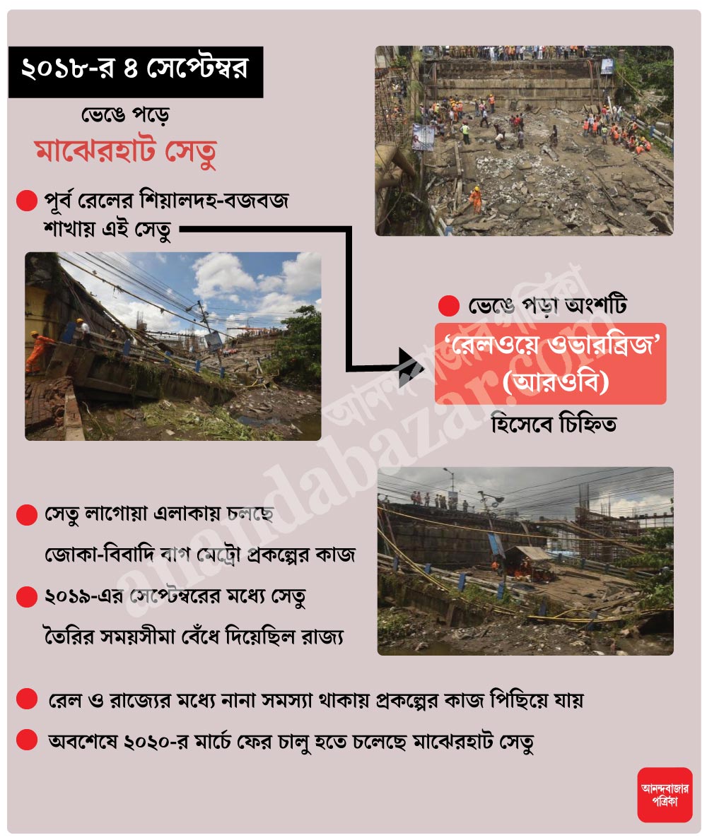মাঝেরহাট সেতুটি পূর্ব রেলের শিয়ালদহ-বজবজ শাখার উপর দিয়ে গিয়েছে। এই সেতুর মাঝের অংশটি ‘রেলওয়ে ওভারব্রিজ’ (আরওবি) হিসেবেই চিহ্নিত করা আছে। পাশাপাশি সেতু লাগোয়া এলাকায় চলছে জোকা-বিবাদি বাগ মেট্রো প্রকল্পের কাজ। দুর্ঘটনার পর ২০১৯-এর সেপ্টেম্বরের মধ্যে ওই সেতু নতুন করে তৈরির সময়সীমা বেঁধে দিয়েছিল রাজ্য। পরে তা পিছিয়ে ডিসেম্বর করা হয়। এ বার নবান্ন সূত্রে জানা যাচ্ছে, আগামী মার্চেই খুলবে মাঝেরহাট সেতু।