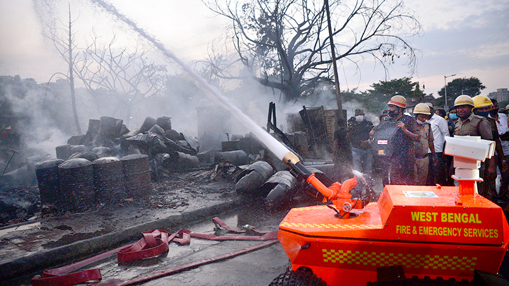 ‘ফায়ার রোবট’ দিয়ে আগুন নেভানোর কাজ চলছে। মঙ্গলবার। ছবি: স্বাতী চক্রবর্তী।