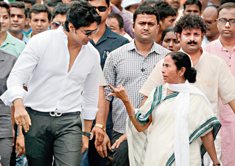 ঢাকুরিয়া সেতু বা হাজরা রোড পুরোটা ‘দখল’ করে নিয়ে মিছিল এগোলেও যোধপুর পার্কের কাছে উল্টো দিকে মিছিলের জন্য কয়েকটি স্কুলবাস দাঁড়িয়ে থাকতে দেখে মুখ্যমন্ত্রী একটু বিব্রত হলেন। সঙ্গে সঙ্গে লালবাজারে ফোন, ‘যাদবপুর ট্রাফিক গার্ডকে দেখতে বলুন।’ যশ ওরফে ছোট পর্দার ‘অরণ্য’কে দেখে যাদবপুর এইট-বি মোড়ের কাছে এক মধ্যবয়সিনী প্রাণপণে ‘ফ্লাইং কিস’ ছুড়ে দিলেন। হাজরা রোডের দু’ধারে পাড়ার মেয়ে-বৌ, বিক্ষিপ্ত অফিসকর্মী বা মজুরদের মমতার আগে হাঁটা পুলিশকর্মীরা দেখালেন, ‘ওই দিকে দেখুন, দেব আসছেন!’