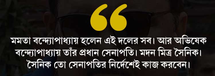 দলে নিজের বর্তমান অবস্থান নিয়ে মদন মিত্র তা হলে সন্তুষ্ট? স্পষ্ট জবাব মেলে না মমতা বন্দ্যোপাধ্যায়ের কয়েক দশকের সঙ্গীর বাক্যে। বলেন, ‘‘আমার দেওয়ালে দু’টো লাইন লেখা রয়েছে। প্রথমটা হল— বস ইজ় নেভার রং। আর দ্বিতীয় লাইন হল— ইফ দ্য বস ইজ় রং, দেন সি দ্য ফার্স্ট লাইন।’’