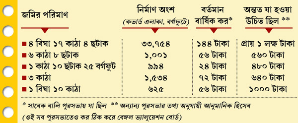 এর জেরেই বিভিন্ন কারচুপি সম্ভব হয়েছে বলে দাবি হাওড়া পুরসভার কর্তাদের। তাঁদের দাবি, এক সময়কার ফাঁকা জমি বা খাটালের জায়গায় পরবর্তী সময়ে বহুতল বা অন্য কিছু তৈরি হলেও নতুন ভাবে পরিমাপ করে নতুন কর ধার্য করেনি সাবেক বালি পুরসভা। যেমন, বেলুড়ের ৫৬ নম্বর ওয়ার্ডের অন্তর্গত জিটি রোডের উপরে একটি তিনতলা বাড়ি রয়েছে। কিন্তু সেটি এখনও ফাঁকা জমি হিসেবেই নথিভুক্ত থাকায় বছরে তার সম্পত্তিকর ‘মাত্র’ ৪০ টাকা।