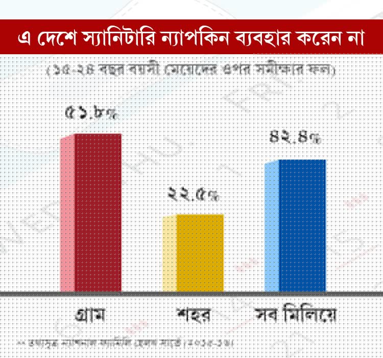 এমনিতে স্যানিটারি ন্যাপকিন ব্যবহার নিয়ে সচেতনতার অভাব, কিনতে যেতে সঙ্কোচ— এ সব এখনও আমাদের সমাজে বড় আকারেই আছে। ন্যাশনাল ফ্যামিলি হেল্থ সার্ভের ২০১৫-১৬ সালের রিপোর্টে দেখা যাচ্ছে, এ দেশে শহুরে মহিলাদের ৭৭.৫ শতাংশ, গ্রামে ৪৮.৫ শতাংশ এবং সব মিলিয়ে ৫৭.৬ শতাংশ স্যানিটারি ন্যাপকিন ব্যবহার করেন। অর্থাত্ গ্রাম-শহর মিলিয়ে এ দেশের ৪০ শতাংশের বেশি মহিলা ঋতুকালীন সময়ে স্বাস্থ্যসম্মত প্যাড ব্যবহার করেন না। এই সমীক্ষাটি করা হয়েছিল ১৫ থেকে ২৪ বছর বয়সী মেয়েদের উপর। আবার ওয়ার্ল্ড হেলথ অর্গানাইজেশনের একটি সমীক্ষায় দেখা যাচ্ছে, ৩৬ শতাংশ ভারতীয় মহিলা দোকানে স্যানিটারি ন্যাপকিন কিনতে যেতে সঙ্কোচ বোধ করেন।