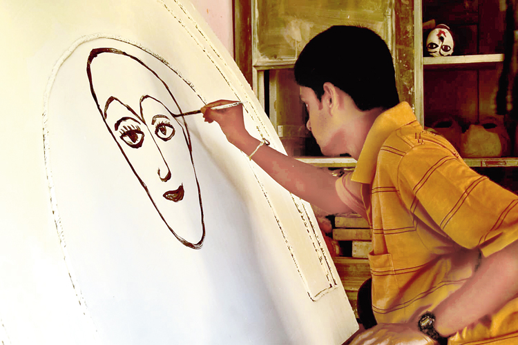 মগ্ন: রং-তুলি হাতে আঁকতে ব্যস্ত টুকাই। রবিবার, কুমোরটুলির প্রদর্শনীতে। নিজস্ব চিত্র