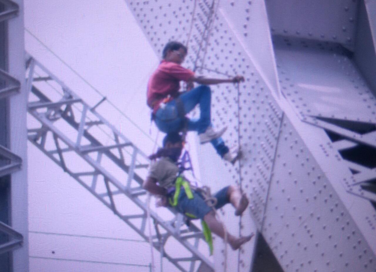 হুলুস্থূল কাণ্ড! রবীন্দ্র সেতুর উপরে কর্তব্যরত ট্রাফিক পুলিশকর্মীদের মাথায় হাত। কখন যে ওই যুবক হাওড়া ব্রিজের ৩৬ ও ৩৭ নম্বর পিলারের মাঝ বরাবর উপরে উঠে পড়েছিল তা কেউ জানে না। নীচ থেকে হাত নাড়া, বাবা-বাছা করেও কোনও লাভ হল না। খবর গেল উত্তর বন্দর থানায়। বার্তা গেল দমকলে। বার্তা গেল বিপর্যয় মোকাবিলা বাহিনীর কাছেও। ঘটনাস্থলে পৌঁছল দমকলের তিনটি ইঞ্জিন ও বিপর্যয় মোকাবিলা বাহিনীও। থমকে গেল যানবাহন। বাড়তে লাগল ভিড়। সকাল সকাল মুফতে পাওয়া মজা লুটতে চায় অনেকেই! অনেকে আবার উদগ্রীব, আশঙ্কিতও। নিরাপদে এই যুবককে নীচে নামিয়ে আনা যাবে তো? ইতিমধ্যে ঘিরে ফেলা হয় ব্রিজের একটা অংশ। অনেক কসরতের পর দমকল ও বিপর্যয় মোকাবিলা বাহিনীর চেষ্টায় বেলা ১২টা নাগাদ দড়ি বেঁধে ঝুলিয়ে ব্রিজের উপর থেকে নামিয়ে আনা হল ওই যুবককে।