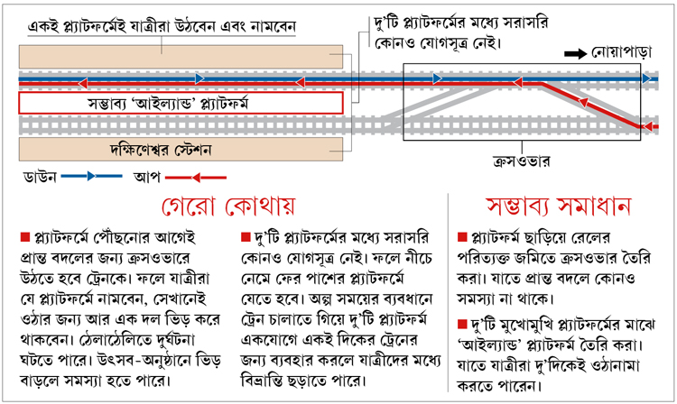 কিন্তু যাত্রী-সংখ্যা বাড়লে একটিমাত্র প্ল্যাটফর্ম থেকে যাত্রীদের ওঠানামা কতটা সমর্থনযোগ্য, তা নিয়ে প্রশ্ন রয়েছে।