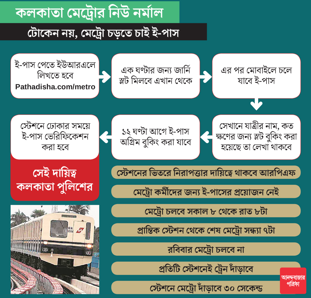 নিউ নর্মালে মেট্রোয় চড়ার ছাড়পত্র দু’টি— স্মার্ট কার্ড এবং ই-পাস। স্মার্ট কার্ড অনেক যাত্রীর কাছেই রয়েছে। নতুন স্মার্ট কার্ড দিতে এবং পুরনোগুলি রিচার্জ করাতে মেট্রোর কাউন্টার খুলবে। মেট্রোর অ্যাপ ব্যবহার করে অনলাইনেও স্মার্ট কার্ড রিচার্জ করা যাবে। ই-পাস পাওয়ার জন্য যাত্রীদের মোবাইল, কম্পিউটার বা ল্যাপটপের ব্রাউজারে গিয়ে ইউআরএলে লিখতে হবে pathadisha.com/metro। সেখানে গেলেই যাত্রীরা ‘জার্নি স্লট’ বুক করতে পারবেন। এর পর এক ঘণ্টার ‘জার্নি স্লট’-এর জন্য যাত্রীর মোবাইলে ই-পাস চলে যাবে। সেখানে লেখা থাকবে কোন সময়ের জন্য তিনি বুক করেছেন, কোন স্টেশন থেকে মেট্রোয় উঠবেন এবং কোথায় নামবেন। পাশাপাশি যাত্রীর নামও লেখা থাকবে। মেট্রো সূত্রের খবর, ই-পাসের ক্ষেত্রে ১২ ঘণ্টা আগে অগ্রিম বুকিংও করা যাবে। স্টেশনে ঢোকার সময় ই-পাসের বৈধতা যাচাই করবে কলকাতা পুলিশ। এর পর সংশ্লিষ্ট যাত্রীকে স্মার্ট কার্ডের গেটে দাঁড়াতে হবে। কার্ড পাঞ্চ করে ঢুকতে হবে স্টেশনে।