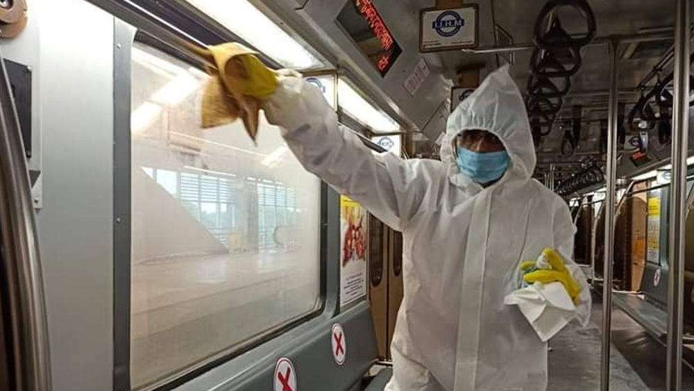 স্যানিটাইজেশনের কাজ চলছে মেট্রোর মধ্যে। নিজস্ব চিত্র।
