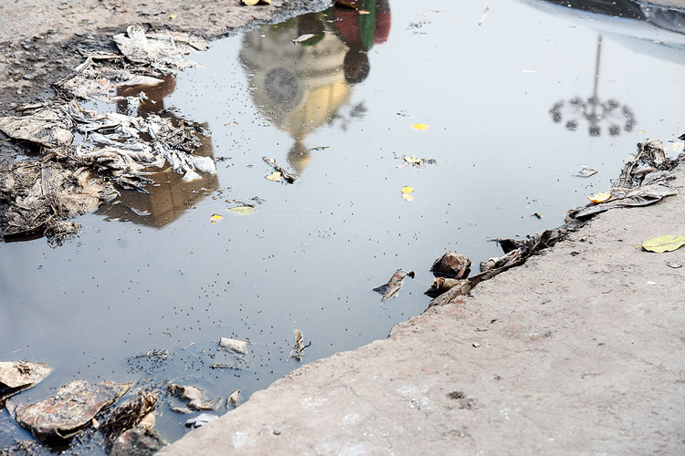 বাড়বাড়ন্ত: ধর্মতলা বাস টার্মিনাসের পাশেই জমা জলে মশা। বুধবার। ছবি: স্বাতী চক্রবর্তী