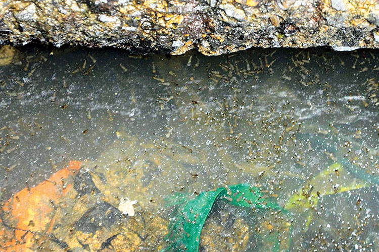 চৌবাচ্চায় মশার লার্ভা। হাওড়া পুরসভার ২৮ নম্বর ওয়ার্ডে। ছবি: দীপঙ্কর মজুমদার