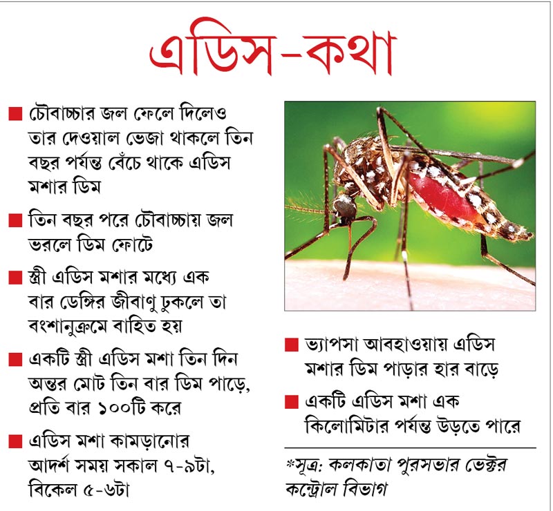 কলকাতা শহরে এ বার ডেঙ্গি তেমন ভাবে দেখা না গেলেও লাগোয়া দক্ষিণ দমদমে যে ভাবে রোগটা ছড়িয়ে পড়ছে, তাতে স্বাস্থ্য ভবন উদ্বিগ্ন। কলকাতার বিভিন্ন সরকারি ভবন, হাসপাতাল ছাড়াও বৃষ্টি কমে যাওয়ার পরে যে ভাবে বিভিন্ন জায়গায় মিষ্টি জলের আধার তৈরি হচ্ছে, তা চিন্তা বাড়িয়েছে স্বাস্থ্য কর্তাদের। পতঙ্গবিদেরা জানাচ্ছেন, দক্ষিণ দমদম থেকে ডেঙ্গির জীবাণুবাহক মশার লাগোয়া কলকাতা পুরসভা এলাকায় চলে আসা কেউ রুখতে পারবে না। তাই দমদম, দক্ষিণ দমদম, সল্টলেক, বরাহনগর, কামারহাটি এবং কলকাতার পুরসভার লাগোয়া ওয়ার্ডগুলিতে জ্বরের রোগীদের চিকিৎসকের কাছে যাওয়ার পরামর্শ দিচ্ছেন স্বাস্থ্যকর্তারা।