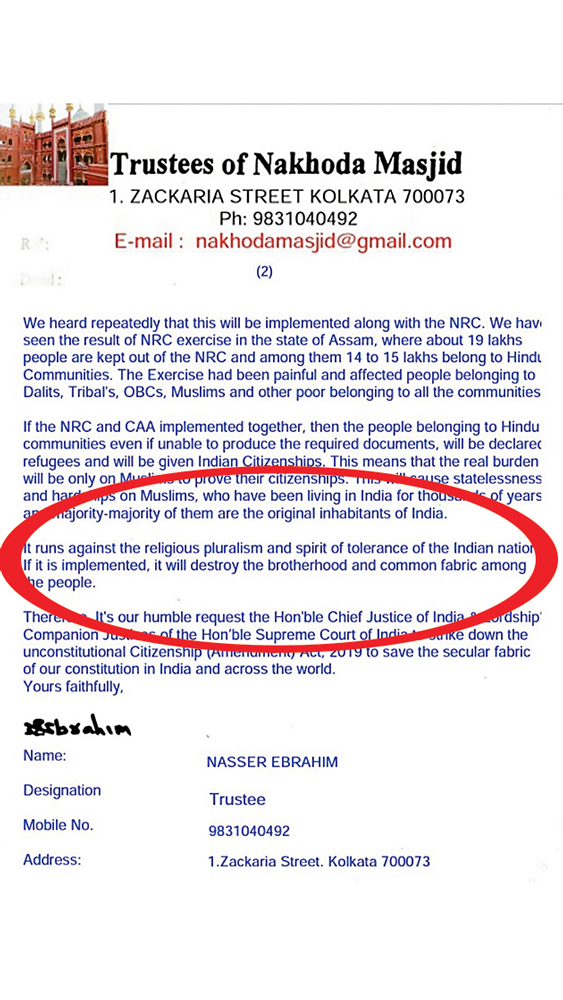 ধর্মের ভিত্তিতে দেশে বিভাজন তৈরির চেষ্টা চলছে। সেটা হচ্ছে সংশোধিত নাগরিকত্ব আইন এবং জাতীয় নাগরিক পঞ্জিকে ঢাল করে। তাতে বিপন্ন বোধ করছেন দেশের মুসলিমরা। নাখোদা মসজিদের ট্রাস্টি বোর্ডের এক সদস্য এই মর্মেই চিঠি লিখলেন সুপ্রিম কোর্টের প্রধান বিচারপতির উদ্দেশে।