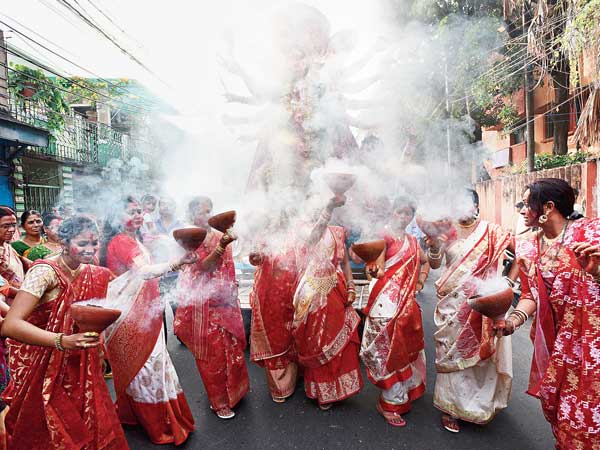 বিসর্জনের পথে। বৃহস্পতিবার, উত্তর কলকাতায়। — সুমন বল্লভ