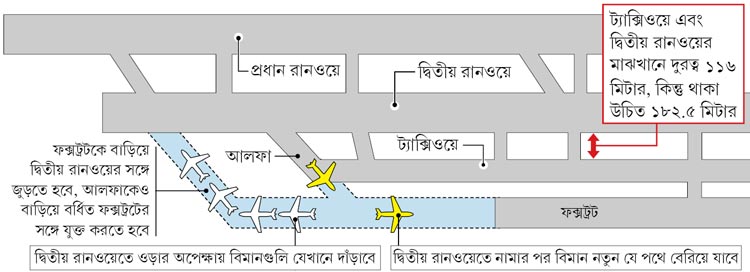 বিমানবন্দর সূত্রের খবর, আলফারও পরে টার্মিনালের দিকে সমান্তরাল যে আর একটি ট্যাক্সি বে রয়েছে, তাকে ‘ফক্সট্রট’ বলা হয়। সেখান দিয়ে বিমান যাতায়াত করলে দ্বিতীয় রানওয়েতে নামা-ওঠায় কোনও সমস্যা হবে না। পরিকল্পনা অনুযায়ী, সেই ফক্সট্রট-কে উত্তর দিকে একেবারে দ্বিতীয় রানওয়ের প্রান্তে নিয়ে গিয়ে যোগ করা হবে। আর সেই বর্ধিত ফক্সট্রট এবং আলফার মাঝখানেও কয়েকটি ট্যাক্সি বে তৈরি করা হবে। তা হলে দ্বিতীয় রানওয়েতে নামার পরে আলফা হয়ে তাড়াতাড়ি বিমান ফক্সট্রটে পৌঁছে যাবে। আর ফক্সট্রট দিয়ে একেবারে দ্বিতীয় রানওয়ের কাছে গিয়ে অপেক্ষা করতে পারবে টেক-অফ করতে চাওয়া বিমান।