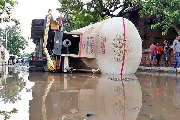 খানাখন্দে ভরা রাস্তার সমস্যায় ভুগছে খিদিরপুর এলাকাও। সেখানে সত্য ডাক্তার রোডে নিয়ন্ত্রণ রাখতে না পেরে বুধবার উল্টে যায় একটি কন্টেনার। নিজস্ব চিত্র