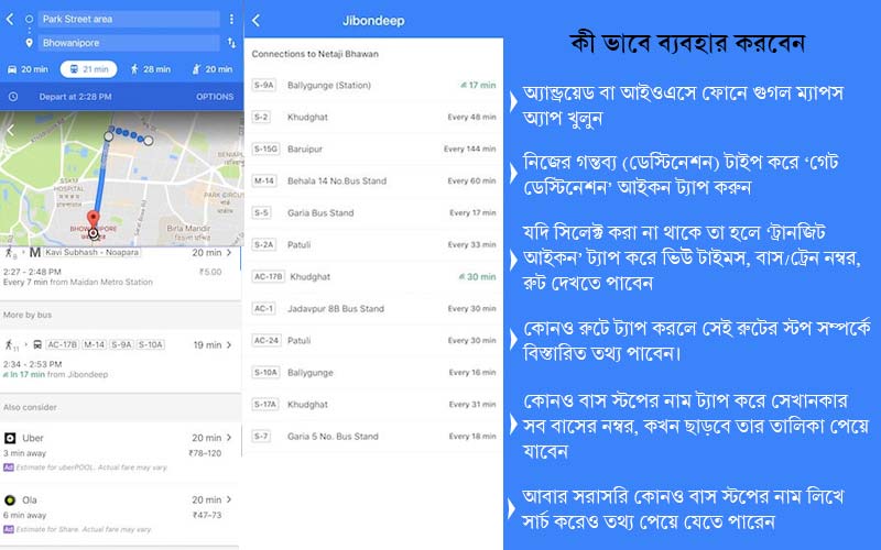 এই অসুবিধার মধ্যে আমাদের প্রায়ই পড়তে হয়। এ বার এই সমস্যারও সমাধান করতে পারবেন আপনার হাতে থাকা স্মার্টফোনটির সাহায্যেই। সৌজন্যে গুগল ম্যাপ ও ডব্লিউবিটিসি। গুগল ম্যাপ ইন্ডিয়ার রিয়েল-টাইম ট্রানজিট ইনফর্মেশনের সাহায্যেই এ বার জানতে পারবেন বাসের টাইম। কোন বাস কোন বাস স্টপ থেকে কখন ছাড়বে, যে কোনও বাসের রুট ম্যাপ, কোন বাস কত সময় অন্তর ছাড়ে সব কিছুই জানিয়ে দেবে গুগল ম্যাপ। এমনকী, অচেনা কোনও জায়গায় যেতে হলেও ডেস্টিনেশন টাইপ করে জেনে নিতে পারেন কোন বাসের সাহায্যে, কোন রুট দিয়ে পৌঁছে যেতে পারেন আপনার গন্তব্যে।