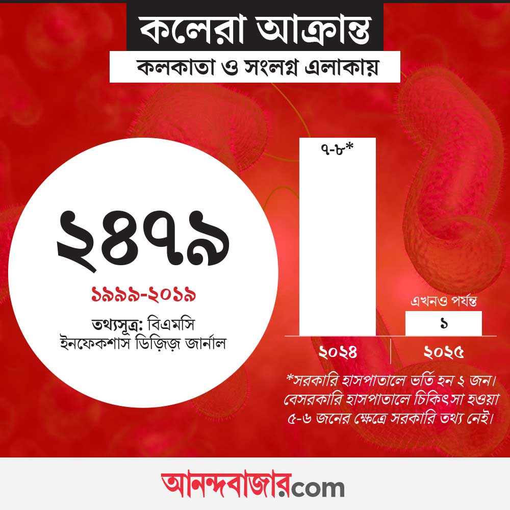 ‘বিএমসি ইনফেকশাস ডিজ়িজ় জার্নাল’-এর দেওয়া পরিসংখ্যান অনুসারে, ১৯৯৯ থেকে ২০১৯ সালের মধ্যে কলকাতায় ২৪৭৯ জন কলেরায় আক্রান্ত হয়েছিলেন। ওই জার্নালে এ-ও বলা হয় যে, পরিশ্রুত পানীয় জল এবং উন্নত নিকাশি ব্যবস্থার কারণে বিশ্বের অনেক দেশ থেকে মহামারির আকার ধারণ করা কলেরা প্রায় নির্মূল হয়ে গেলেও ভারতের ক্ষেত্রে তা হয়নি।