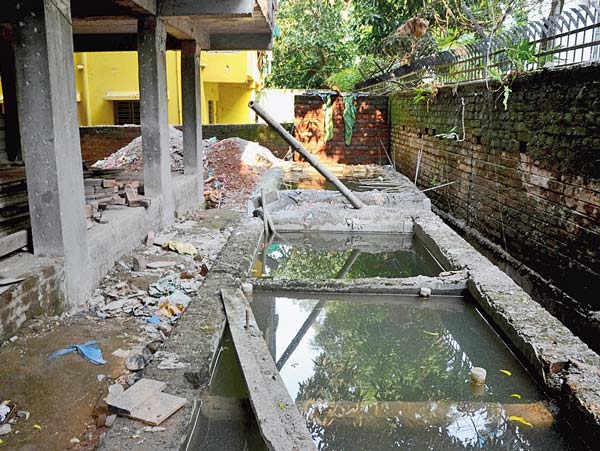 আঁতুড়: সল্টলেকের নয়াপট্টিতে এক নির্মীয়মাণ বাড়িতে জমে আছে জল। —নিজস্ব চিত্র।