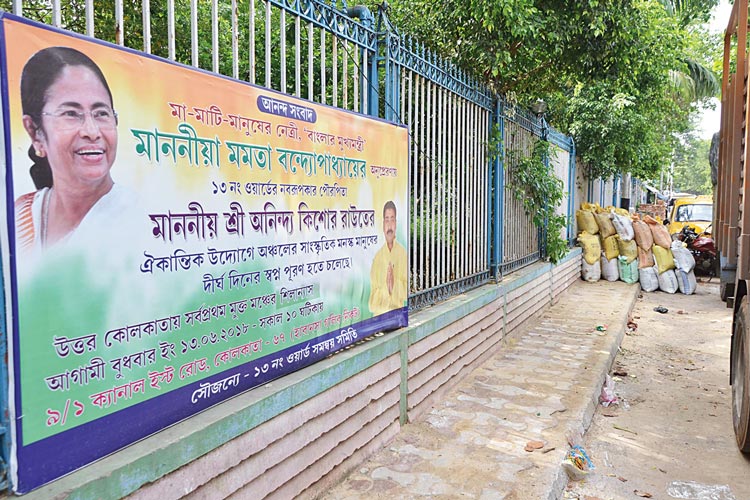 এক দুপুরে গিয়ে দেখা গেল, উদ্যানের গায়ে কাউন্সিলরের নাম-সহ মুক্তমঞ্চ গড়ার ব্যানার ঝুলছে। চলছে খোঁড়াখুঁড়ি। আগের মতোই সদর আটকে পরপর দাঁড়িয়ে লরি, মোটরবাইক। মুক্তমঞ্চ গড়া নিয়ে উচ্ছ্বসিত কাউন্সিলরের থেকে কিছু প্রশ্নের উত্তর মেলেনি। দখল হয়ে যাওয়া আরও জায়গা থাকতে হঠাৎ শিশু উদ্যান তুলে মুক্তমঞ্চ করার পরিকল্পনা কেন? ট্রাক, লরি পার্কিং না সরালেও কি জনগণ ওই মুক্তমঞ্চে অনুষ্ঠান করতে আসবেন? পনেরো ফুট চওড়া উদ্যানে ২০০ দর্শক বসবেন কোথায়? সব প্রশ্ন শুনে অনিন্দ্যবাবুর একটাই উত্তর, ‘‘ভাল প্রকল্পে খারাপ খুঁজে লাভ নেই। সাধারণ মানুষের জন্য উত্তর কলকাতার প্রথম মুক্তমঞ্চ হচ্ছে এটি।’’