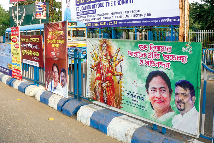 পুজো এবং অন্যান্য পরব মিটে গিয়েছে অনেক দিন। বিভিন্ন সম্মেলন, জমায়েত, অভ্যর্থনার পর্বও সারা। অথচ মূল রাস্তার দু’ধারে রয়ে গিয়েছে হোর্ডিং, তোরণ, ওভারহেড গেট। এমনটাই কার্যত দস্তুর হয়ে উঠেছে শহরের উত্তর থেকে দক্ষিণ, পূর্ব থেকে পশ্চিমের বিভিন্ন প্রান্তে, এমনকি দমদম রোডের মতো রাস্তাতেও।