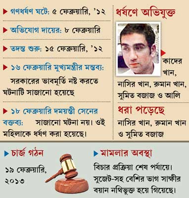২০১২ সালের ৫ ফেব্রুয়ারি। পার্ক স্ট্রিটের এক পানশালায় সুজেটের সঙ্গে আলাপ জমিয়েছিল কাদের আর তার বন্ধুরা। ফেরার সময় বিশ্বাস করে তাদের গাড়িতে উঠেছিলেন সুজেট। অভিযোগ চলন্ত গাড়িতেই তাঁকে ধর্ষণ করে কাদের। বাকিরা মদত জোগায়। রবীন্দ্র সদনের কাছে সুজেটকে গাড়ি থেকে রাস্তায় ফেলে দিয়ে পালিয়ে যায় তারা।
