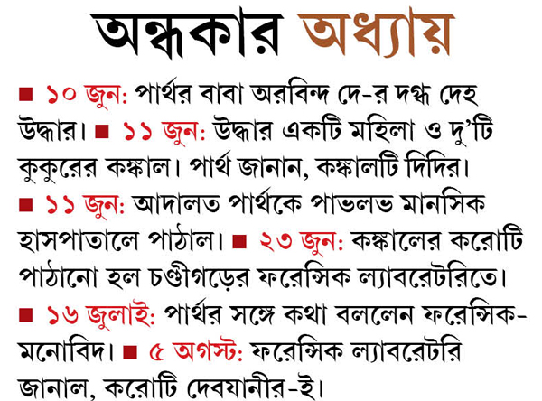 ৩ নম্বর রবিনসন স্ট্রিটের সেই বাড়িতে ফিরতে এখন আর পা সরছে না পার্থ দে-র। শুধু তা-ই কেন, ওই বাড়িতে ফেরার কথা ভাবলে রীতিমতো ‘ভয়’ই করছে তাঁর। আড়াই মাস আগে (১০ জুন) তাঁর বাবা অরবিন্দ দে-র দগ্ধ দেহ উদ্ধারের সূত্রেই ওই বাড়িতে প্রথম ঢোকে পুলিশ। তার পর সামনে আসে দিদি দেবযানী এবং দুই কুকুরের কঙ্কাল-রহস্য। সেই সময়কার পার্থ বাড়ি থেকে বেরোতেই চাইতেন না। পৃথিবীর সঙ্গে কোনও যোগাযোগ রাখতে চাইতেন না। তাঁকে বাইরে এনে পাভলভ হাসপাতালে পাঠাতে ভাল রকম বেগ পেতে হয়েছিল পুলিশকে। আড়াই মাস পাভলভে থেকে চিকিৎসার পরে সেই পার্থই এখন বলছেন, ‘‘ফাঁকা বাড়িটা আমাকে তো গিলে খেতে আসবে! ওখানে আমি আর থাকতে পারব না।’’