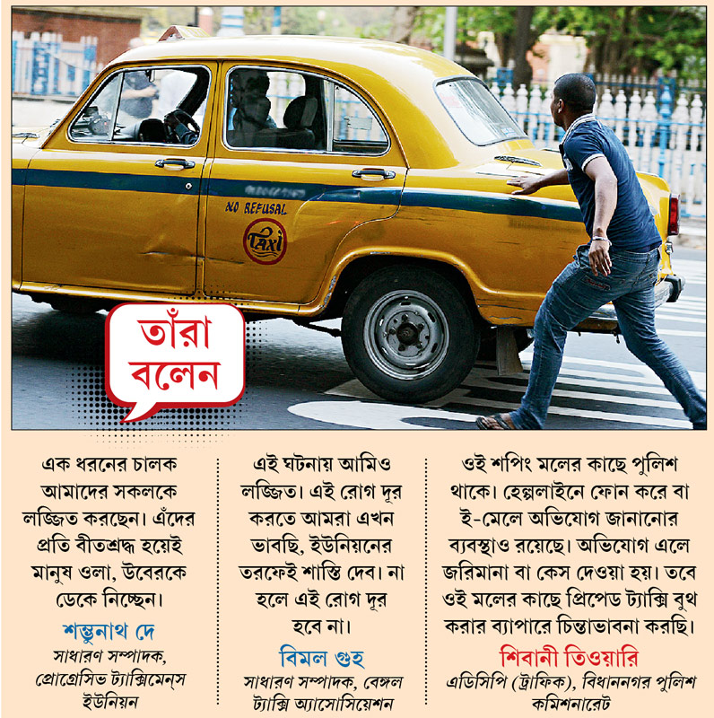 বুধবার, সন্ধে পৌনে সাতটা। সল্টলেকের সিটি সেন্টার থেকে ফিরব বেহালায়। সঙ্গে আমার স্ত্রী। ওই শপিং মলের সামনেই আলো-আঁধারি রাজপথে হন্যে হয়ে ট্যাক্সি ধরার চেষ্টা করছি দু’জন। পরপর জনা তিনেক ট্যাক্সিচালক সটান না বলে চলে গিয়েছেন। বিরক্ত লাগছিল, রাগ হচ্ছিল। তবে, এ শহরের ট্যাক্সি সংস্কৃতির সঙ্গে অভ্যস্ত বলেই জানি, এখানে ট্যাক্সি ধরতে হলে আগে ধৈর্য ধরতে হবে। না হলে এই ধারাবাহিক ‘যাব না’র ঠেলা সামলাব কী করে! যদি কেউ ‘দয়া পরবশ’ হয়ে যেতে রাজিও হন, তবে তাঁকেও যে ওই দয়ার জন্য অতিরিক্ত ৩০-৪০ টাকা গুনে গুনে ‘নজরানা’ দিতে হবে, তা তো নিজেদের অভিজ্ঞতা থেকেই জানি।