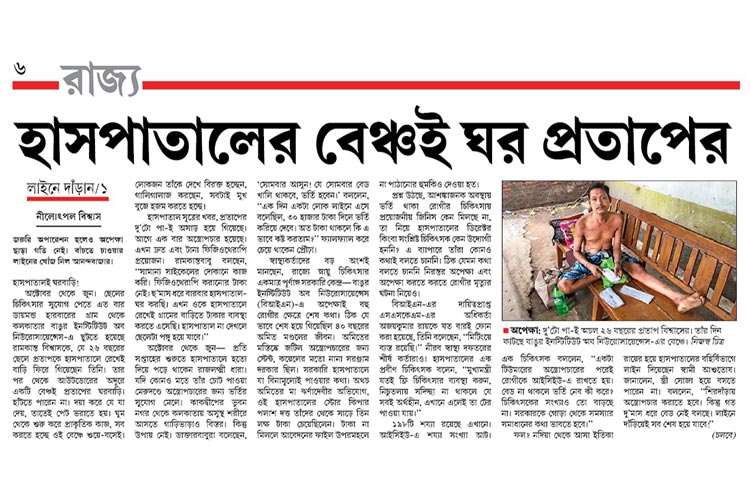 এক হাসপাতালের আউটডোরের অদূরের বেঞ্চ থেকে অন্য এক হাসপাতালের শয্যা। আপাত ভাবে প্রতাপ বিশ্বাসের জীবনে বদল হয়েছে এটুকুই। অভিযোগ, এর বাইরে প্রায় পঙ্গু প্রতাপ চিকিৎসার ছিটেফোঁটাও পাচ্ছেন না। অন্য দিকে, ছেলের চিকিৎসার জন্য টাকার জোগাড় করতে যাওয়া বাবা এখনও জানতে পারেননি তাঁর ছেলের এই ঠাঁই-বদল। বাবার সঙ্গে কোনও রকম যোগাযোগও করতে পারছেন না প্রতাপ। হাসপাতালে যাঁকেই সামনে পাচ্ছেন, তাঁর কাছেই এই যুবকের আর্তি, ‘‘যে ভাবেই হোক আমার বাড়িতে একটা খবর দেবেন?’’