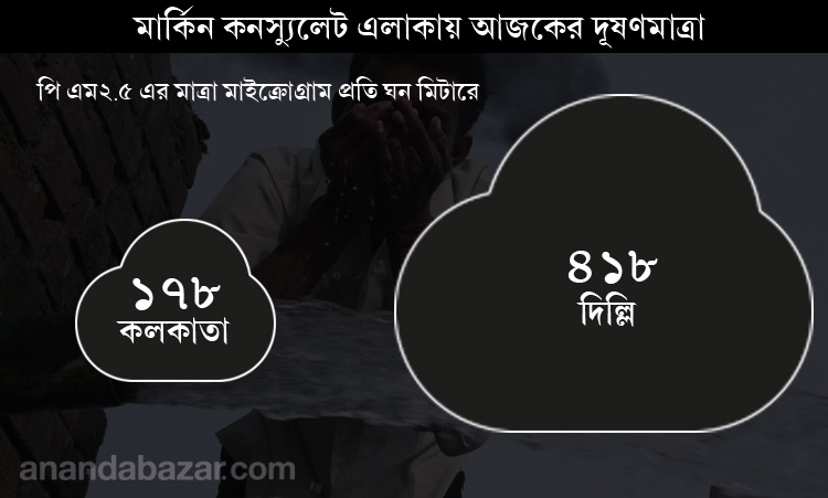 কলকাতা, দিল্লি সমেত বেশ কয়েকটি শহরে মার্কিন কনস্যুলেট নিজস্ব পরিকাঠামোয় অতি সূক্ষ্ম ধূলিকণার (পিএম ২.৫) মাত্রা নিয়মিত ভাবে পরিমাপ করে। উদ্দেশ্য, কনস্যুলেটের কর্মীরা কোন পরিবেশে কাজ করছেন তা জানা এবং জানানো। সেই তথ্য কনস্যুলেটের ওয়েবসাইটে প্রতি ঘণ্টায় আপডেটও করা হয়। ওয়েবসাইটের সেই তথ্য অনুযায়ী, গত রবি, সোম এবং মঙ্গলবার কলকাতা শহরে বায়ুদূষণের পরিমাণ দিল্লির তুলনায় অনেকটাই বেশি ছিল। দিল্লির দূষণ বেশ কয়েক বছর ধরেই গোটা দুনিয়ায় আলোচিত বিষয়। কিন্তু কলকাতা যে তাকেও টপকে গিয়েছে এমন তথ্য সামনে আসায় কলকাতাবাসী চমকে যান।