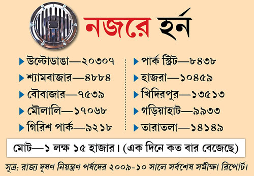 বাসচালকের পাশের সিটে বসে কোচিং সেন্টারে যাচ্ছিলেন মানিকতলার বাসিন্দা বাংলা অনার্সের ছাত্র চিরদীপ নিয়োগী। আচমকা বেসরকারি বাসের হর্নের শব্দে বাঁ কানে তালা লেগে যায়। রাতে অসহ্য যন্ত্রণা। পরীক্ষায় দেখা যায়, কানের ভিতরের কোষগুলি এয়ারহর্নের মাত্রাছাড়া শব্দে চিরকালের মতো খারাপ হয়ে গিয়েছে। শুধু চিরদীপই নয়, কলকাতায় এ রকম উদাহরণ অসংখ্য। বিকট হর্নের দাপটে প্রতিদিনই কিছু মানুষ পাকাপাকি বা অস্থায়ী ভাবে বধির হয়ে যাচ্ছেন বলে উদ্বিগ্ন শহরের ইএনটি বিশেষজ্ঞরা।