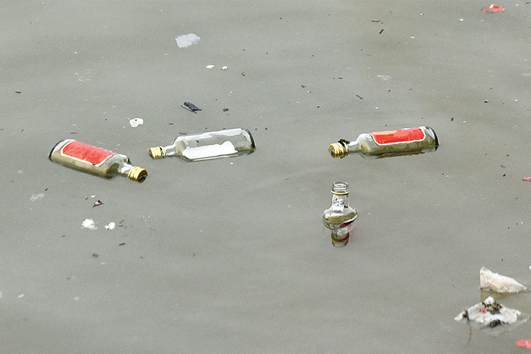 বুধবার বিকেলে ওই প্রবীণ দাঁড়িয়েছিলেন গঙ্গার দিকে মুখ করে। তাঁর ছেলের বয়সি এক জন হাতে-হাতে কয়েকটি বোতল এগিয়ে দিলেন। বৃদ্ধ বোতল কপালে ঠেকিয়ে নমস্কার করলেন। কাকে? বোতলের তরল না নদীকে? ছিপি খোলা হল। গঙ্গার জলে মিশে গেল সস্তার হুইস্কি ও রামের ধারা। ধর্ম থেকে জিরাফ— সব ধরনের বর্জ্যের ভিড়ে কলকাতার মলিনরঙা গঙ্গায় প্রতিমার কাঠামোর মতো ভাসতে থাকল শূন্য বোতলও।