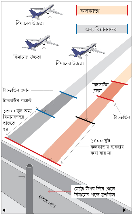 কলকাতা বিমানবন্দর সূত্রের খবর, এই কারণেই যখন যশোর রোডে মাটির উপর দিয়ে মেট্রো সম্প্রসারণের কথা ওঠে, তখন আপত্তি করেছিলেন বিমানবন্দর কর্তৃপক্ষ। একে তো চিমনি এবং গাড়ির জন্য কাঙ্ক্ষিত উচ্চতায় নামতে পারে না বিমান। তার উপরে মাথার উপর দিয়ে মেট্রো রেলের লাইন পাতলে বিমানের উচ্চতা আরও বাড়াতে হবে। বিমানবন্দরের পাঁচিলের গায়ে অত উঁচুতে মেট্রোর লাইন গেলে পাইলটকে নামার সময়ে আরও উপর দিয়ে উড়ে এসে নামতে হবে। ফলে ডিসপ্লেসড থ্রেশহোল্ড ১৪০০ ফুটের অনেক বেশি করতে হবে। সে ক্ষেত্রে রানওয়েতে নামার জন্য জায়গা কমে যাবে। সেই কারণে আপত্তি জানিয়েছিলেন বিমানবন্দর কর্তৃপক্ষ। মেট্রো রেল সেই আপত্তি মেনে ওই এলাকায় মাটির নীচ দিয়েই ট্রেন চলবে বলে ঠিক করেছে।