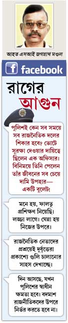 শনিবার সন্ধে সাড়ে সাতটা। গিরিশ পার্কে সাব ইনস্পেক্টর জগন্নাথ মণ্ডল গুলিবিদ্ধ হওয়ার পর তিন ঘণ্টা কেটে গিয়েছে। বন্দর এলাকার ওসি নিজের ফেসবুক দেওয়ালে লিখলেন— ‘পুলিশই কেন সব সময়ে সব রাজনৈতিক দলের শিকার হবে? ভোটারদের নিরাপত্তা এবং ভোটযন্ত্র ও ভোটকর্মীদের সুরক্ষা দেওয়ার দায়িত্বে ছিলেন আমাদের এক জন অফিসার। কিন্তু বিনিময়ে তিনি পেয়ে গেলেন তাঁর জীবনের সব চেয়ে দামি উপহার— একটি বুলেট!’