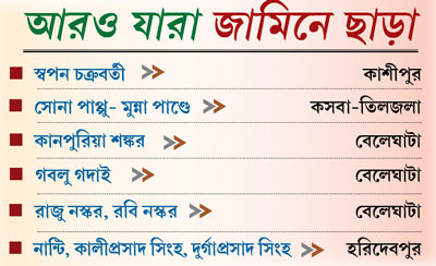পুলিশের একটি সূত্রের খবর, কেবল স্বপন বা আনোয়ার নন, বেলেঘাটার তৃণমূল নেতা ও বহু অপরাধমূলক কার্যকলাপে অভিযুক্ত কানপুরিয়া শঙ্করের দুই ছেলে গবলু ও গদাইকে বেআইনি অস্ত্র-সহ গ্রেফতার করেছিল পুলিশ। কিন্তু তারাও জামিনে ছাড়া পেয়েছে। শুধু বিরোধীরাই নন, স্থানীয় বাসিন্দাদের অনেকেরই অভিযোগ, লোকসভা ভোট এবং পুরসভা ভোটে শাসক দলের হয়ে এরাই ‘ভোট করিয়েছিল’ বেলেঘাটায়। কানপুরিয়া শঙ্কর নিজেও অবশ্য জামিনে মুক্ত। একই ভাবে কসবা-তিলজলার দুষ্কৃতী সোনা পাপ্পু, মুন্না পাণ্ডের মতো দুষ্কৃতীদের বিরুদ্ধে গুলি চালানো, তোলাবাজি, মারধর-সহ একগাদা অভিযোগ থাকলেও এখন জামিনে মুক্ত তারা।