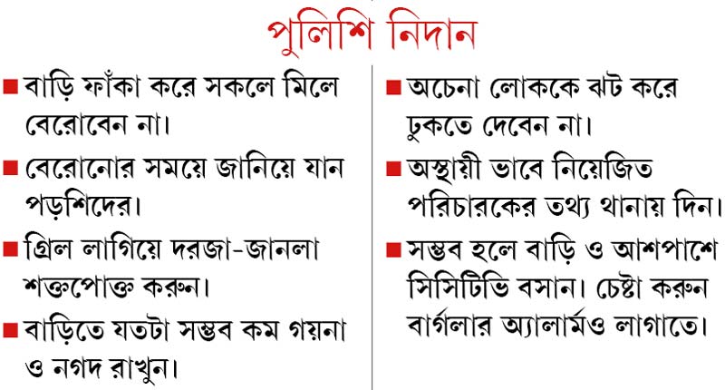 গৃহস্থকে পুলিশের পরামর্শ, দুর্গাপুজো, কালীপুজোর আগে অনেকে বাড়ি, আসবাব ঝাড়পোছ করাতে দু’-তিন দিনের জন্য কাজের লোক রাখেন। এরা মূলত ভিন্ রাজ্যের। এদের একাংশ সুযোগ বুঝে নগদ ও গয়না হাতিয়ে নিয়ে পালায়। তাই কাজে রাখার আগে এদের নাম, ঠিকানা, ছবি, ফোন নম্বর স্থানীয় থানায় জমা করুন। এই ধরনের অপরাধ নিউ আলিপুর, আলিপুর, ভবানীপুর, টালিগঞ্জ, গড়িয়াহাট, বড়বাজার, পোস্তা ও লেক এলাকায় বেশি হচ্ছে বলে জানিয়েছে পুলিশ।