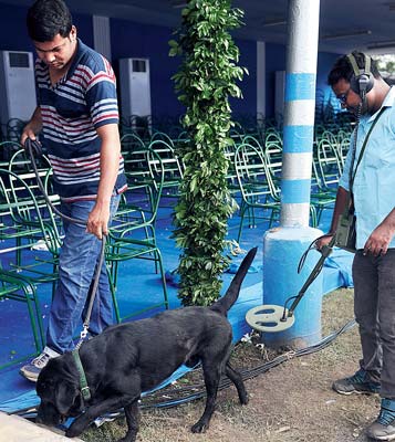 সতর্ক: মিছিলের আগে পুলিশ কুকুরের পরিদর্শন। সোমবার, রেড রোডে। ছবি: বিশ্বনাথ বণিক