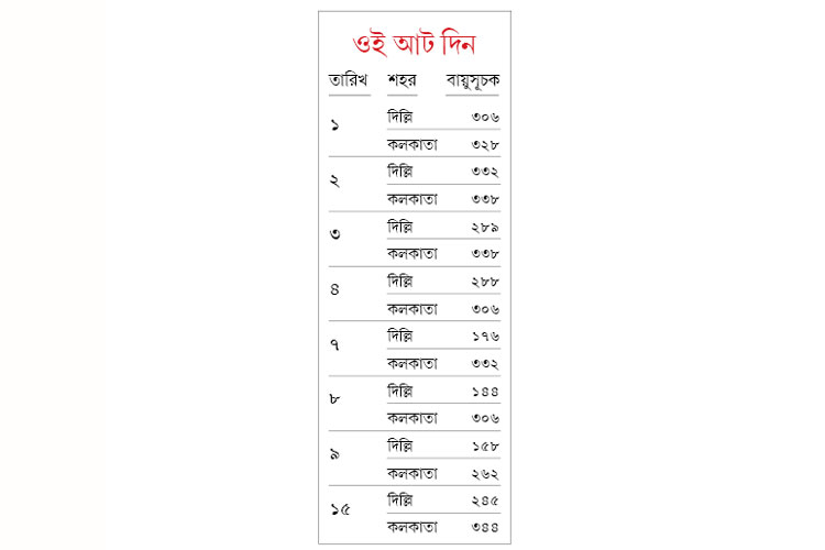 ফের বায়ুদূষণের নিরিখে দিল্লিকে পিছনে ফেলল কলকাতা। এ বার এক দিন, দু’দিন নয়। ধারাবাহিক ভাবে আট দিন!
