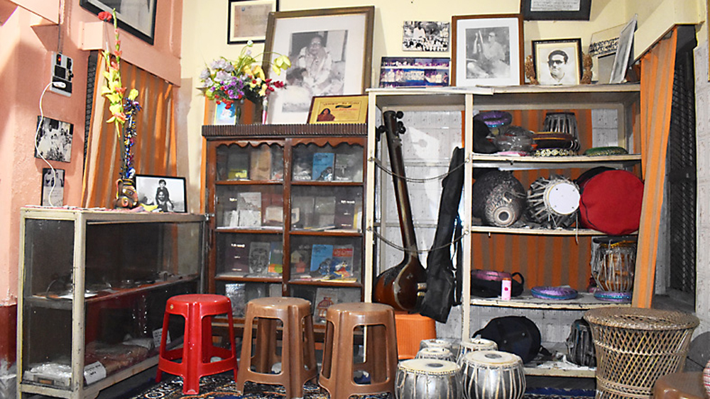 বাড়ির ভিতরে বহু দুষ্প্রাপ্য বই, নথি এবং বাদ্যযন্ত্র নষ্ট হতে বসেছে। রবিবার, ব্যারাকপুরে। ছবি: মাসুম আখতার