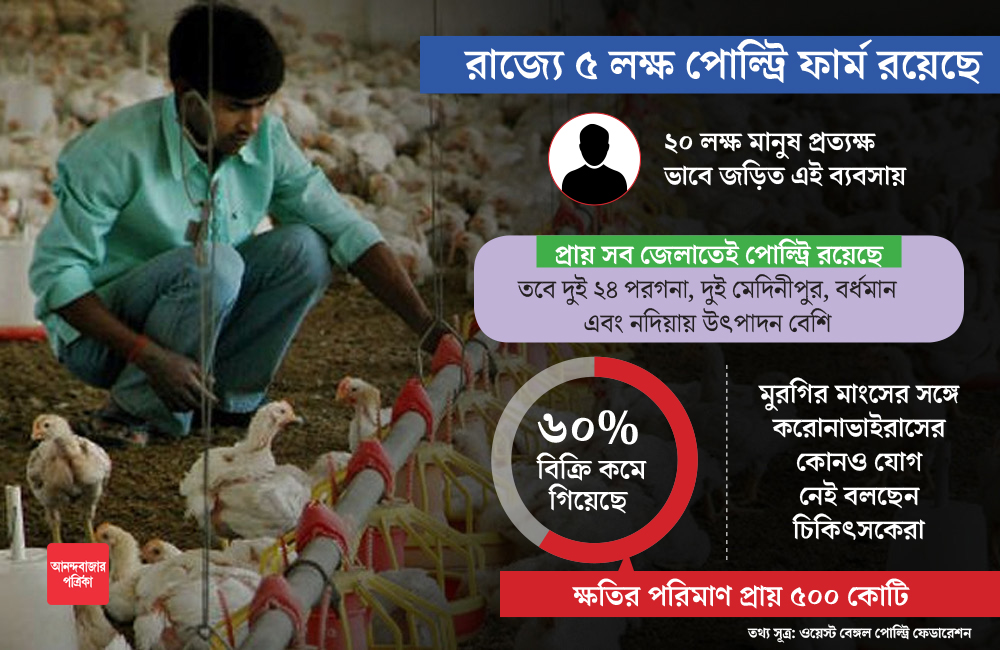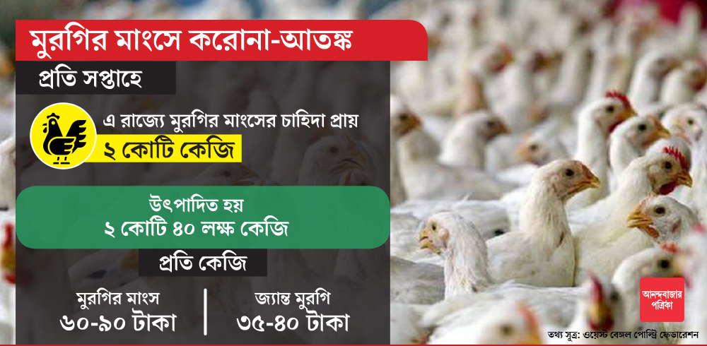 ওয়েস্ট বেঙ্গল পোল্ট্রি ফেডারেশনের তথ্য বলছে, করোনা-আতঙ্কের জেরে মুরগির মাংসের বিক্রি ৬০ শতাংশ কমে গিয়েছে। প্রতি সপ্তাহে রাজ্য জুড়ে ২ কোটি ৪০ লক্ষ কেজির আশপাশে মুরগির মাংস উৎপাদন হয়। রাজ্যে চাহিদা রয়েছে ২ কোটি কেজি-র আশপাশে। এখন বেশি পরিমাণে উৎপাদন হচ্ছে। বিদেশেও রফতানি করা হয়। রাজ্যে প্রায় ৫ লক্ষ পোল্ট্রি রয়েছে। দুই ২৪ পরগনা, দুই মেদিনীপুর, বর্ধমান এবং নদিয়া জেলায় পোল্ট্রি রয়েছে সব চেয়ে বেশি। ২০ লক্ষ মানুষ সরাসরি পোল্ট্রি ব্যবসার সঙ্গে যুক্ত রয়েছে। মুরগির মাংসের খুচরো বিক্রেতা ধরলে আরও ২০ লক্ষ মানুষের রুটিরুজি জড়িত। মদনমোহন মাইতির বক্তব্য, “৬০ শতাংশ বিক্রি কমে গিয়েছে। করোনা-আতঙ্ক রোখা না গেলে, ক্ষতির পরিমাণ দাঁড়াতে পারে হাজার কোটির কাছে।”