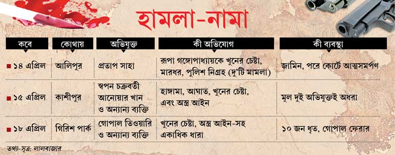 অন্য দিকে লালবাজারের কর্তাদের যুক্তি: পুলিশের রুল-বুক অনুযায়ী যা যা করা উচিত, থানাকে তা-ই করতে বলা হয়েছে। তাঁরা জানিয়েছেন, কাশীপুরের ঘটনায় ইতিমধ্যে বেশ কয়েক জন ধরা পড়েছে। মঙ্গলবার যেমন গ্রেফতার হয়েছে স্বপনের ‘ডান হাত’ হাফিজুল। আবার গিরিশ পার্ক-কাণ্ডে গোপালের এক শাগরেদ-সহ দশ জন গ্রেফতার হয়েছে। গোপালের বাড়িতে তল্লাশিতে মিলেছে আগ্নেয়াস্ত্র ও বিস্ফোরকের সম্ভার।