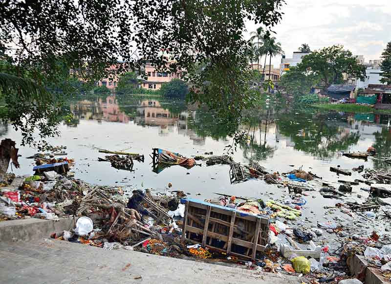 আবর্জনায় ভর্তি স্থানীয় জলাশয়। শনিবার, টালিগঞ্জ এলাকায়। নিজস্ব চিত্র