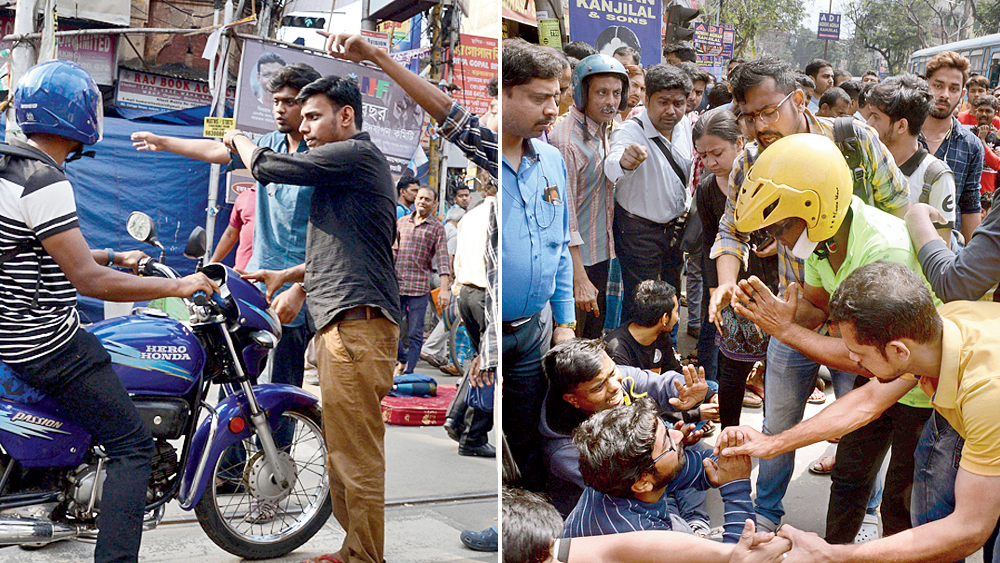 বাইক-আরোহীকে অন্য পথে ঘুরে যেতে বলছেন ছাত্রেরা। (ডান দিকে) হাত জোড় করে পড়ুয়াদের অবরোধ তুলে নেওয়ার অনুরোধ করছেন যাত্রীরা। শুক্রবার, কলেজ স্ট্রিট চত্বরে। ছবি: সুদীপ ঘোষ